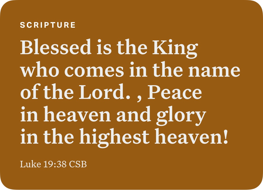 Verse for Palm Sunday bible.com/bible/1713/luk.19.38.CSB Share this: Share on X (Opens in new window) X Share on Facebook (Opens in new window) Facebook Like Loading...